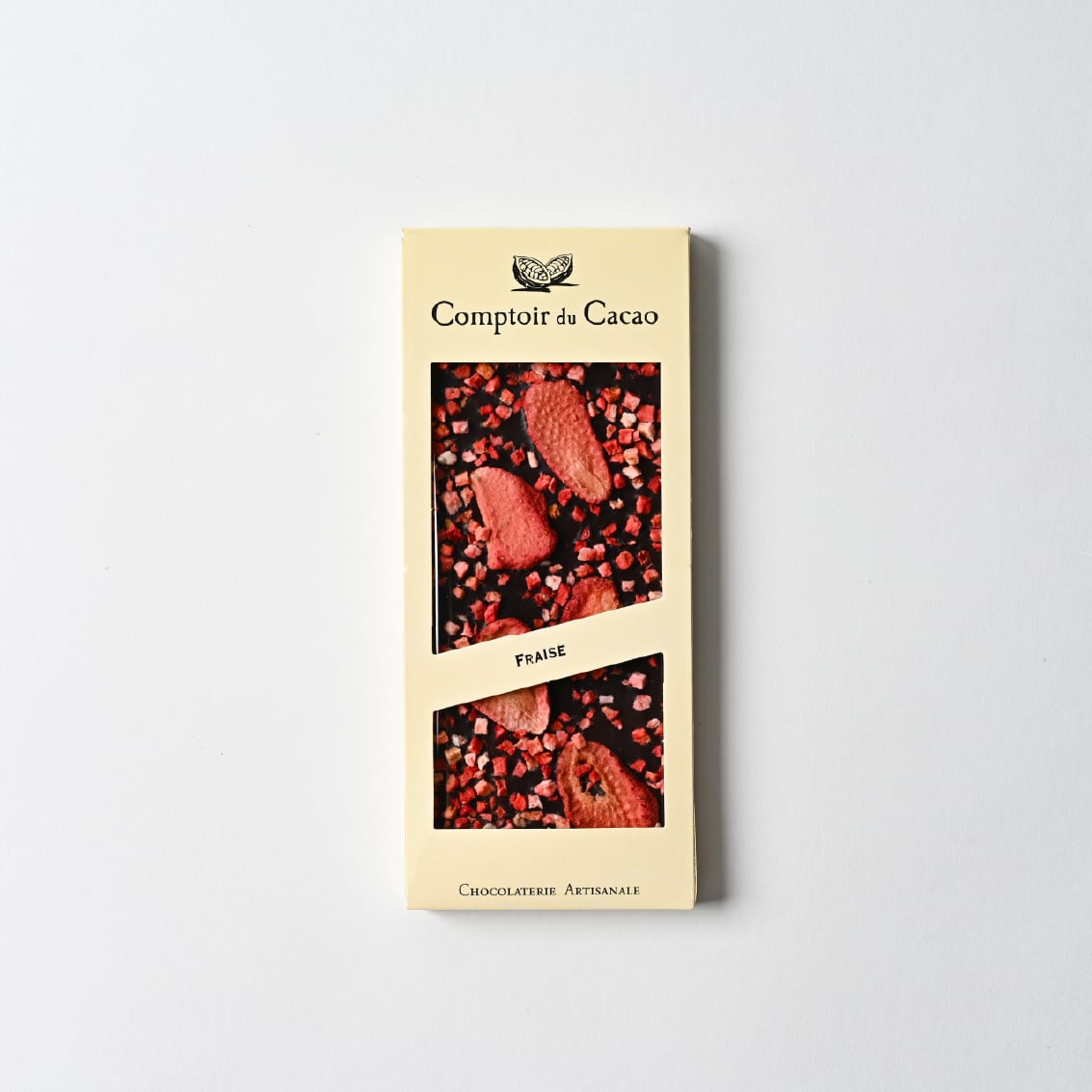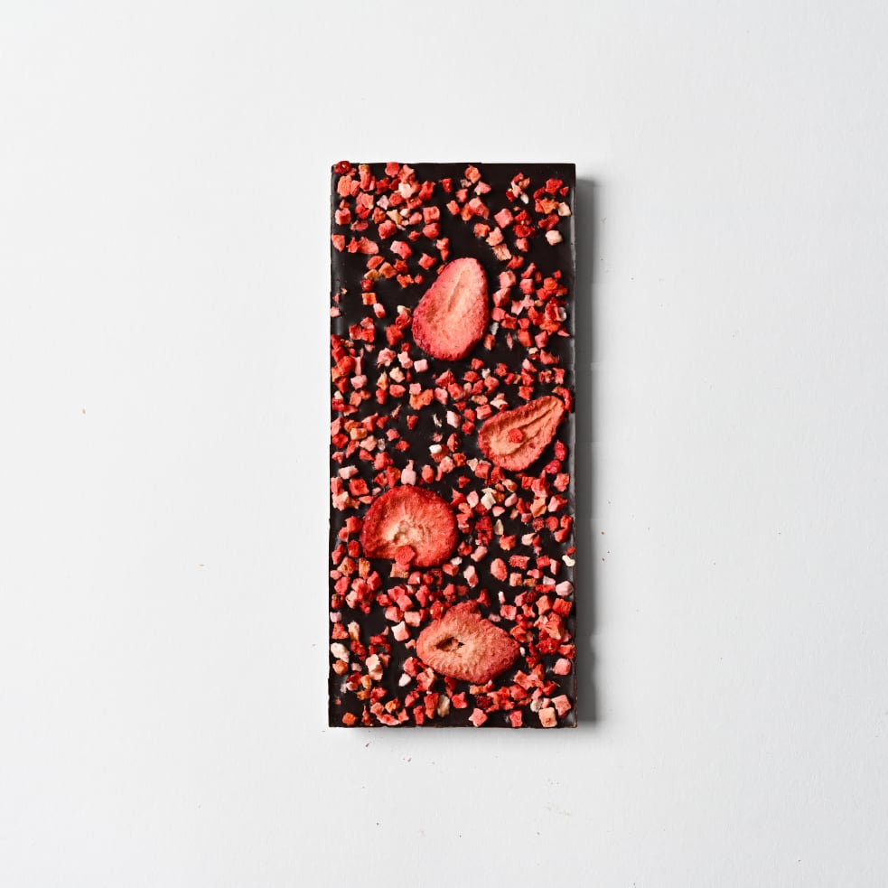 甘酸っぱいサクサクのフリーズドライストロベリー入りのダークチョコレートです。風味良いイチゴとカカオ組み合わせ、華やかな見た目と食感もお楽しみ下さい。