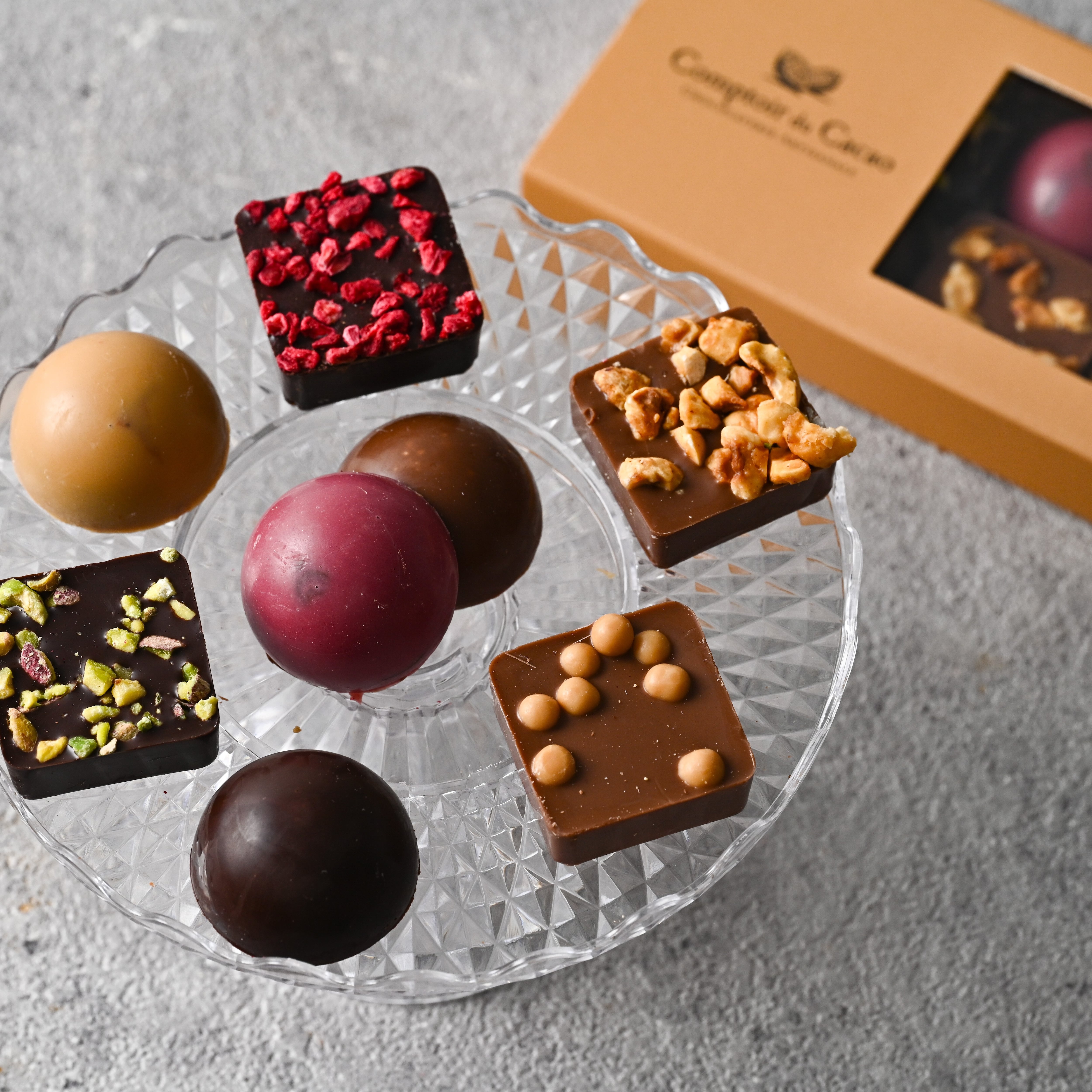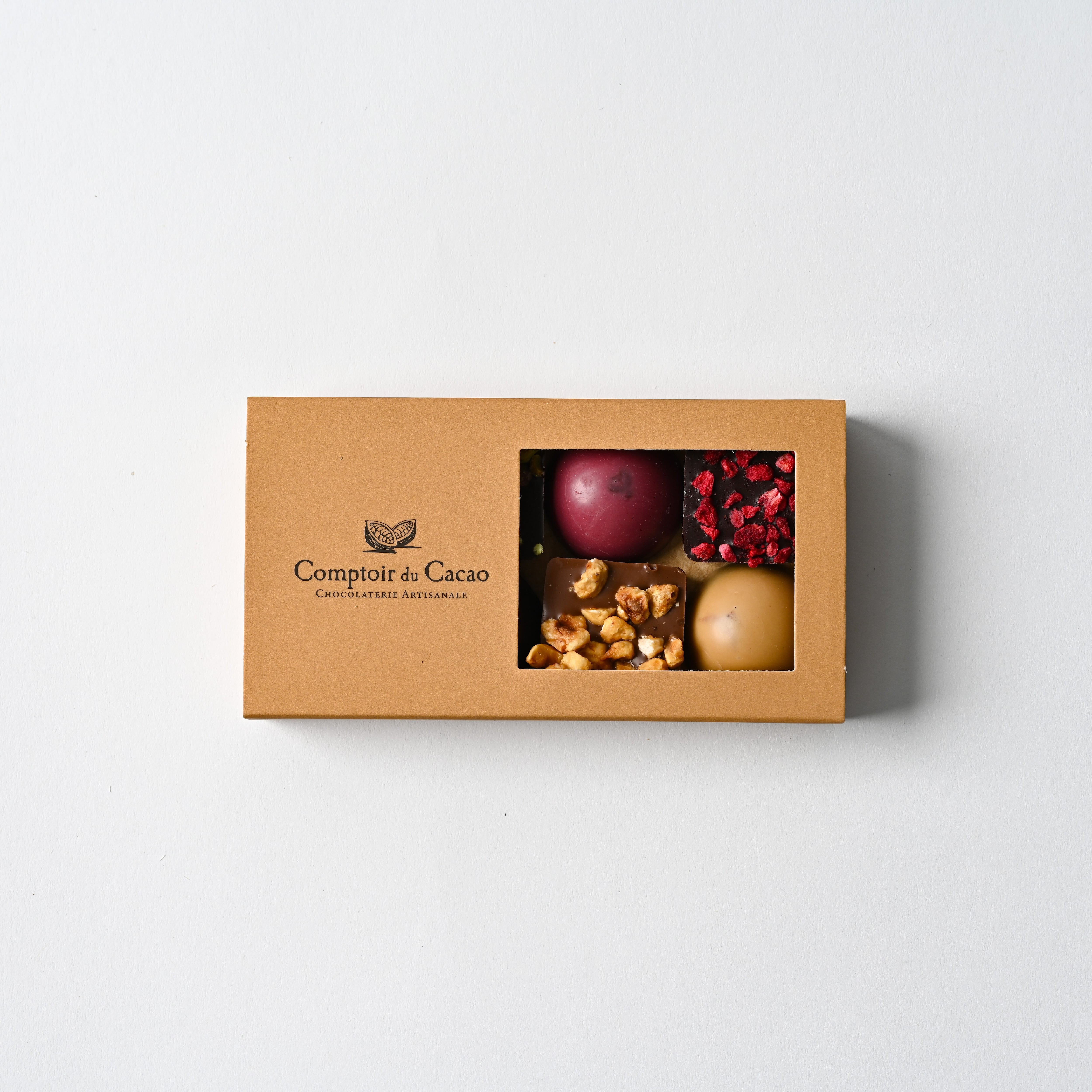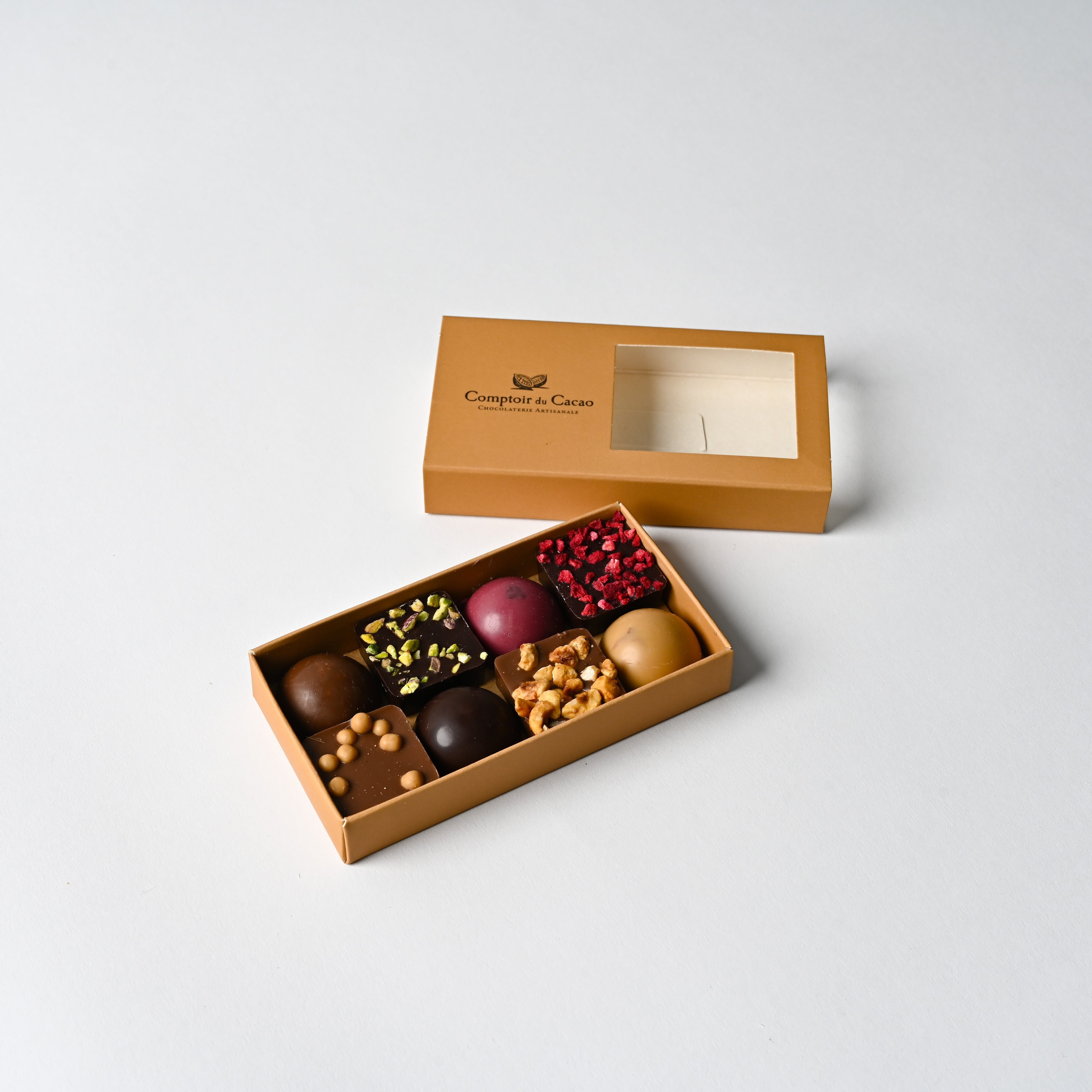 「コントワール・デュ・カカオ」のプラリネ8種類を楽しめるひと箱です。