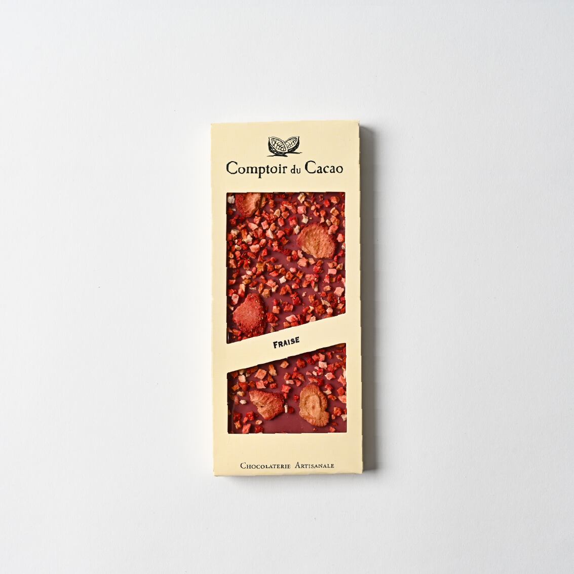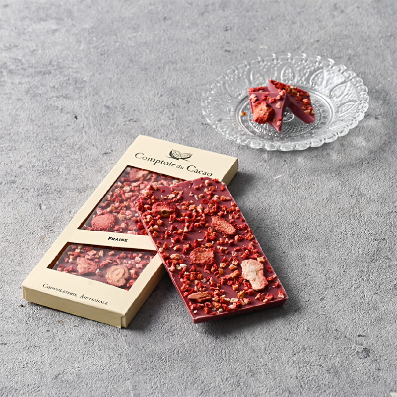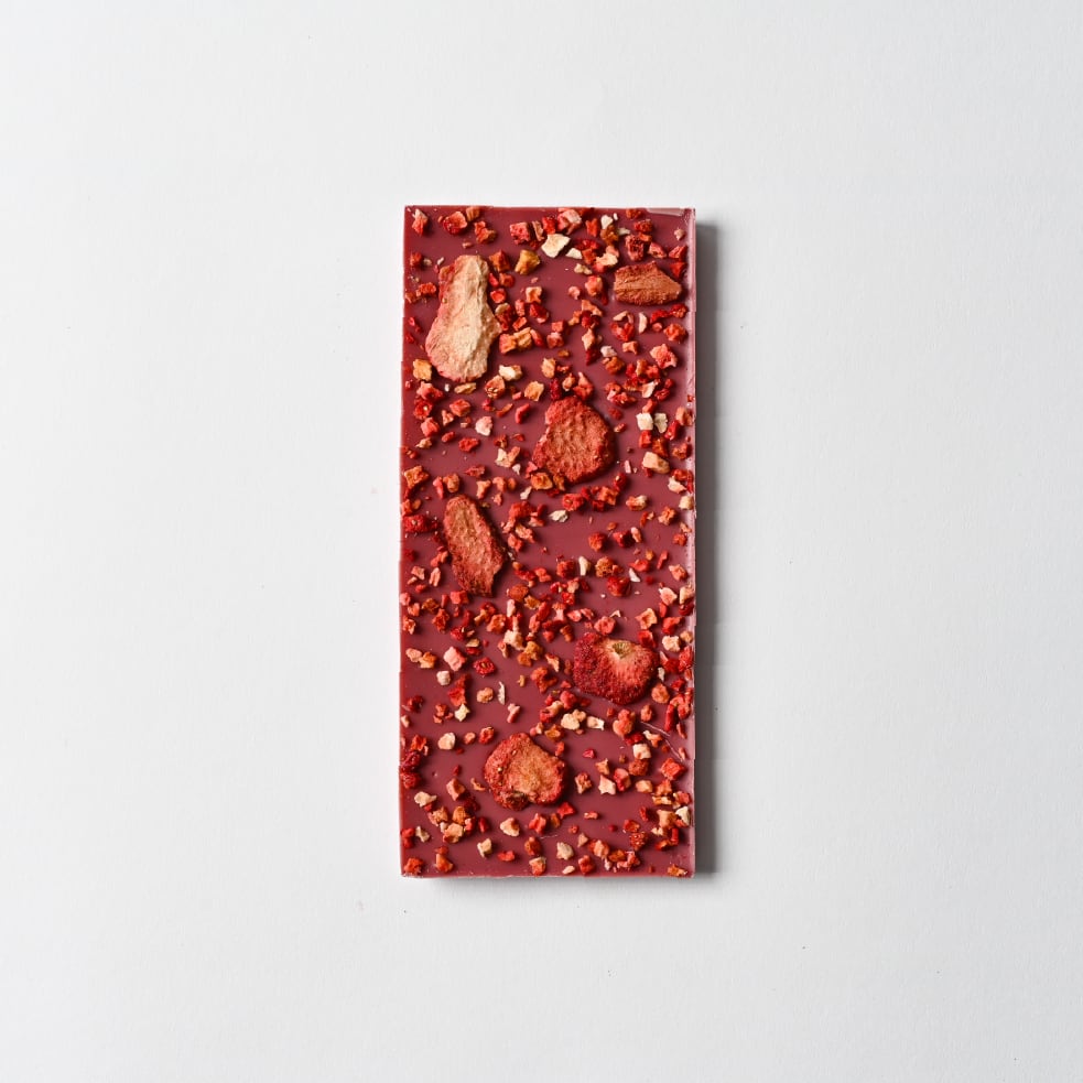 Barry Callebautが発明した80年ぶりの奇跡、話題のルビーカカオから作られる着色料不使用ながらもルビー色が美しい、ルビーチョコレートにサクサクドライストロベリースライスを並べた抜群にかわいいチョコレートです。繊細なルビーカカオの風味にさわやかないちごの酸味がさえわたる、間違いなしのコンビネーションはやみつきのおいしさです。