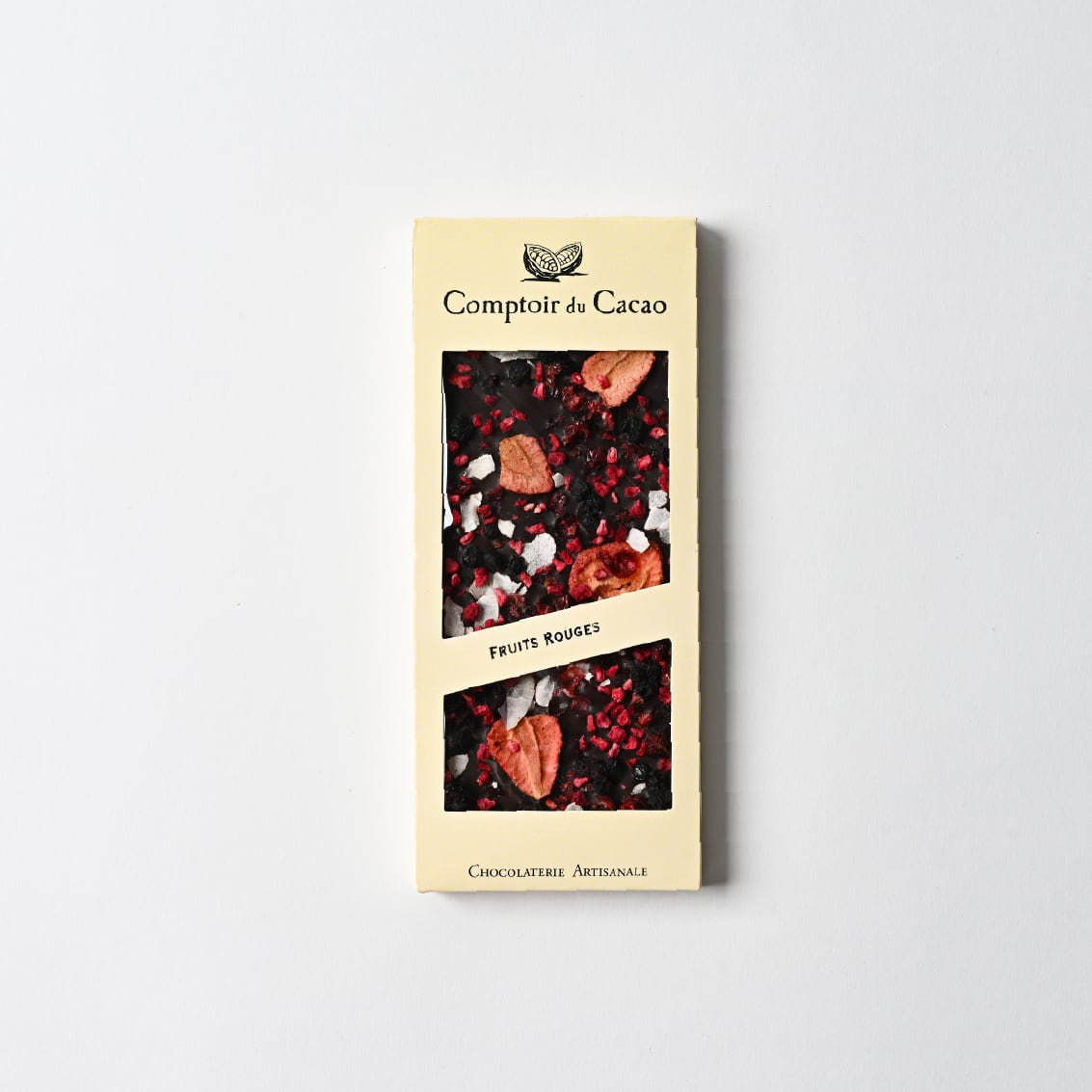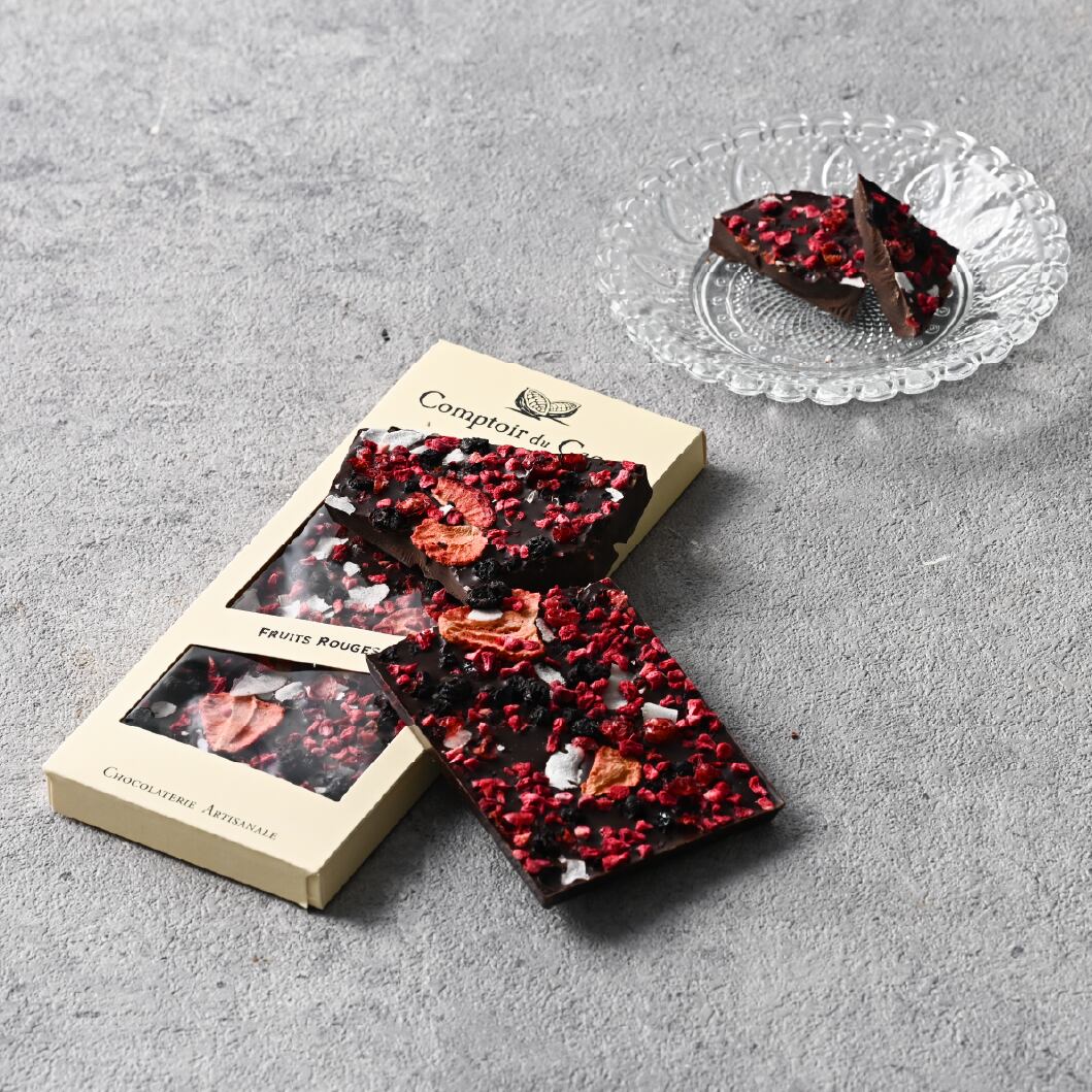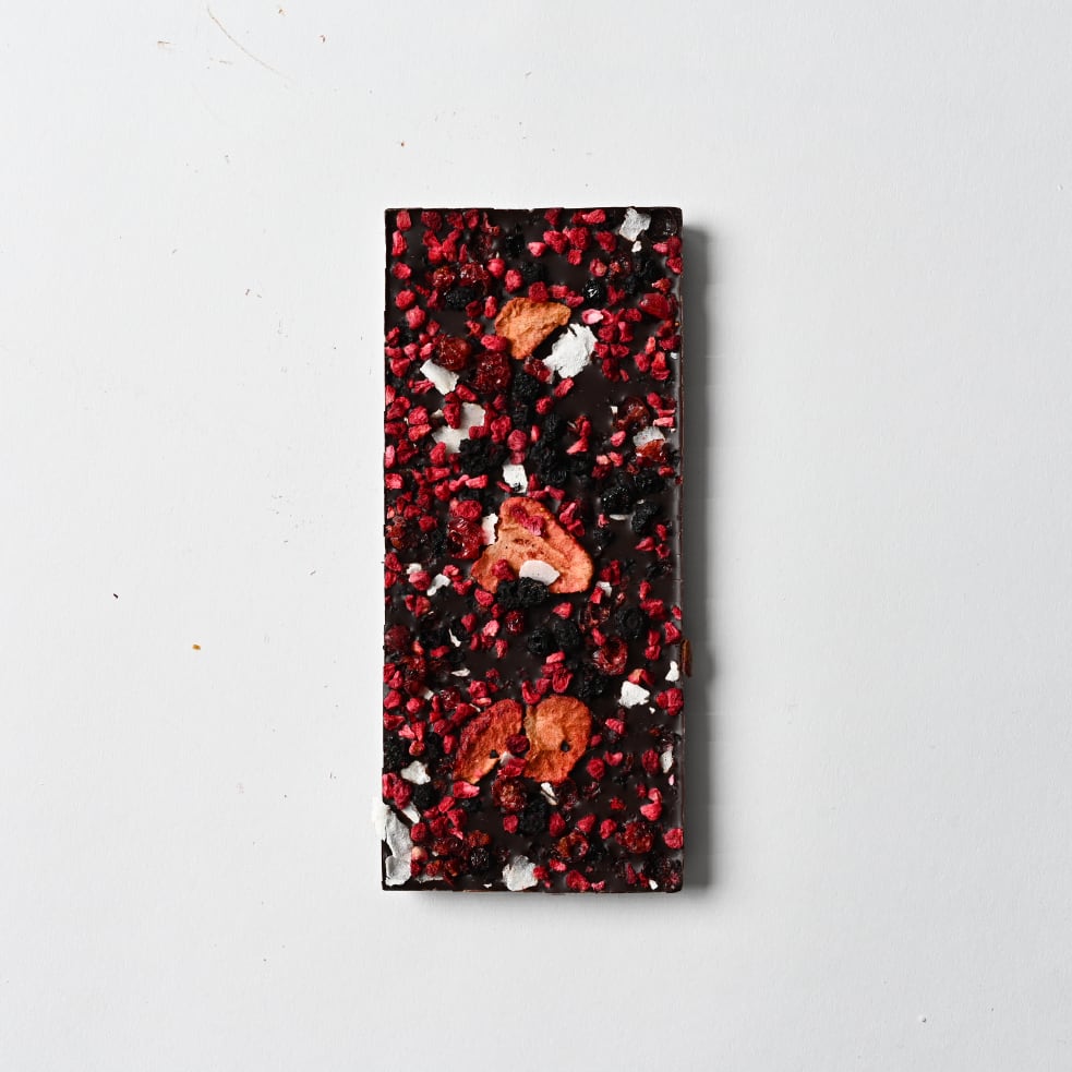 甘酸っぱい4種類のフリーズドライベリーとココナッツスライスのダークチョコレート。