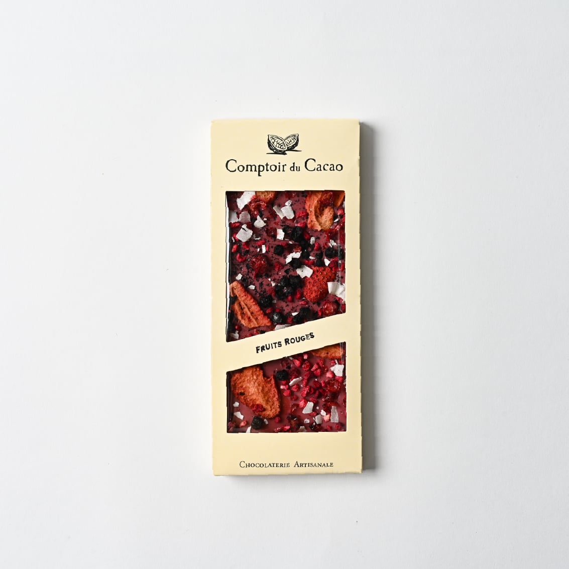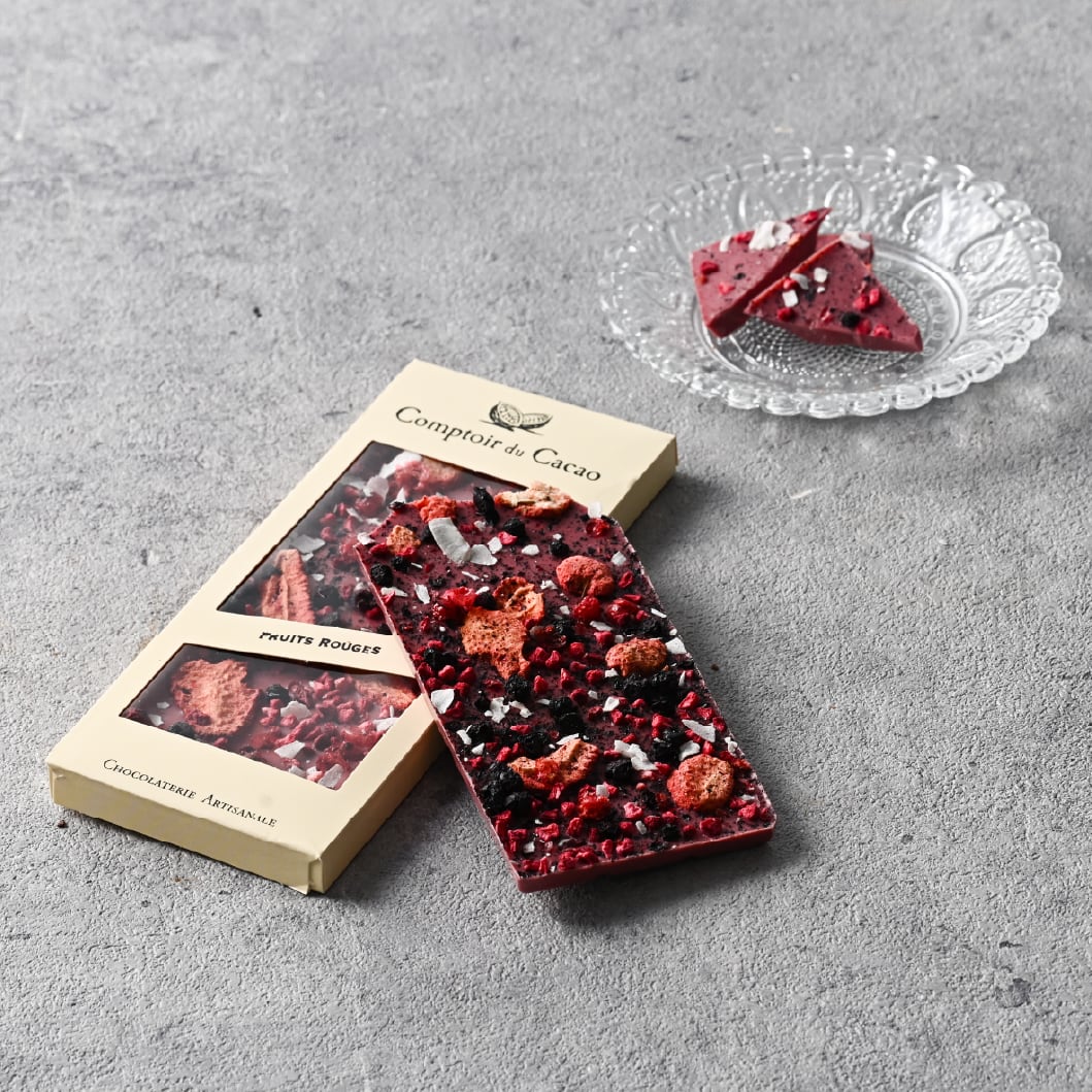 甘酸っぱい4種類のフリーズドライベリーとココナッツスライスのルビーチョコレート。